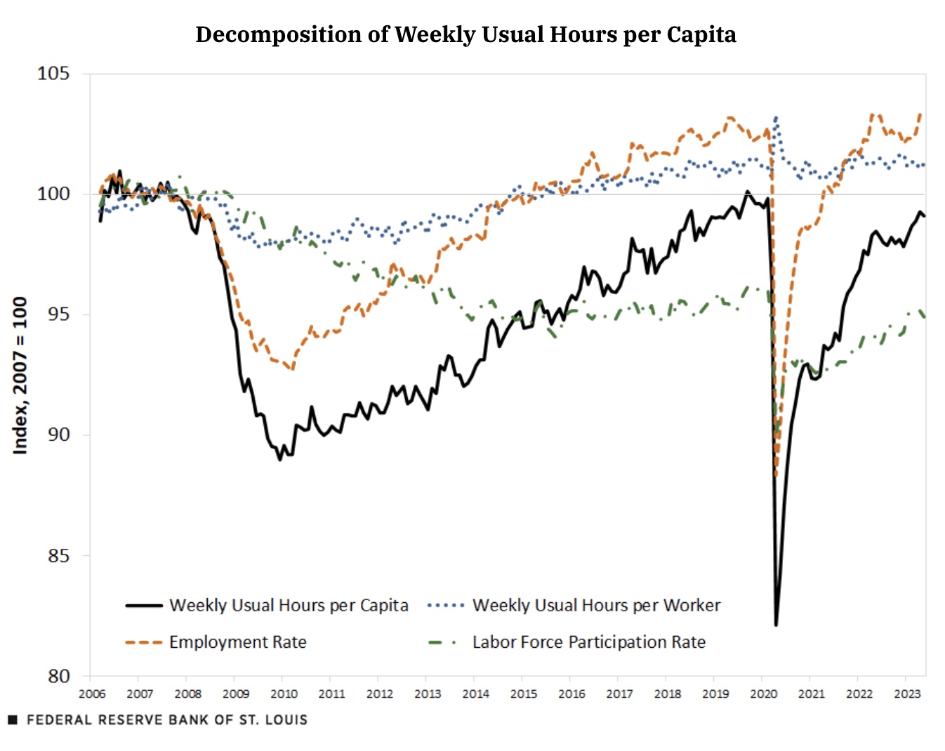 圣路易斯联储的研究人员Serdar Birinci以及Trần Khánh Ngân写道:“为了研究工作时间变化的驱动因素,我们将人均每周正常工作时间指数分解为三个子指数:每个工人的每周正常工作时间、就业率和劳动力参与率。”