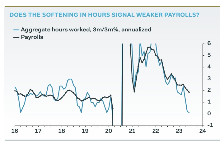 他表示:“第二季度非农类型的总工作时间折合成年化季率仅增长0.1%,并且你必须一直回顾到2009年第四季度——其中除了新冠疫情带来的冲击,才能发现这是一个非常疲软的季度。”“需要明确的是,工作时间比就业人数更加不稳定,两者之间的偏差通常可以通过工时回归基准就业趋势来解释。”