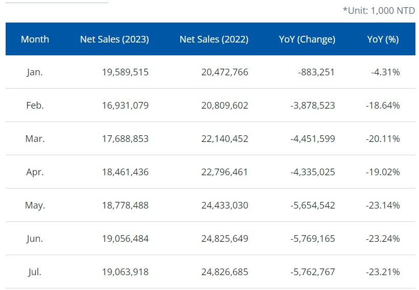智通财经APP获悉,全球领先的晶圆代工厂商联电(UMC.US)公布7月份净销售额约为1,910万新台币(大约60万美元),相比于去年同期下降23.21%,但是较今年6月微增0.04%。7月联电净销售额创下今年第二高,仅次于1月。年初至今的净销售额约为新台币1.296亿元,较去年同期相比下降19.2%。