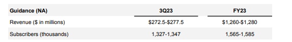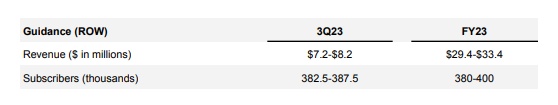 该公司预计,在北美地区外的全球其它地区,2023年第三季度营收区间为720万-820万美元,订阅用户数区间为38.2万-38.8万;预计全年营收区间为2940万-3340万美元,订阅用户数区间为38万-40万。