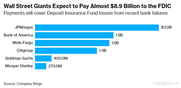 智通财经APP获悉,美国最大的六家银行预计将支付近89亿美元,以帮助补充美国政府的存款保险基金,此前该基金曾被用来支持硅谷银行和签名银行的无保险储户。摩根大通(JPM.US)预计支付的金额最大,约为30亿美元,其次是美国银行(BAC.US)和富国银行(WFC.US),将分别支付近20亿美元。花旗集团(C.US)预计将支付至多15亿美元,该行也是最后一家披露支付金额的大型银行。