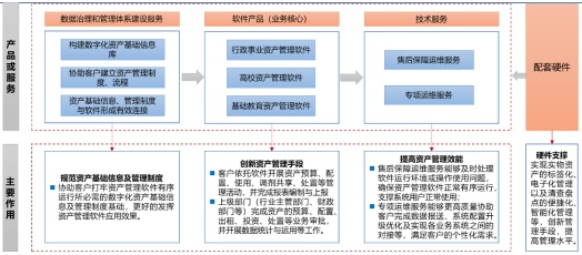 报告期内,公司以软件开发为核心,并提供相关技术服务及配套硬件产品,共同组建资产管理信息化体系,公司各项业务之间的流程及主要关系示意图如下: