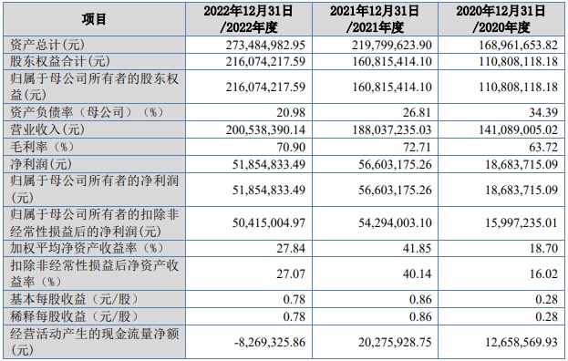 财务方面,于2020年、2021年、2022年,公司实现营业收入分别为1.41亿元、1.88亿元、2.01亿元,其中,公司实现净利润分别为1868.37万元、5660.32万元、5185.48万元。