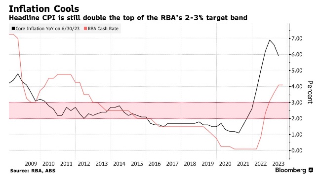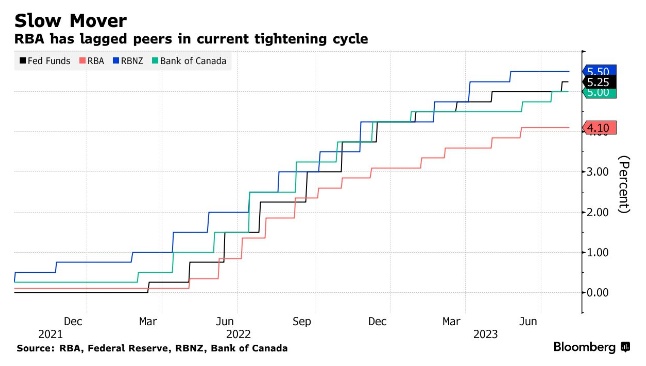 在当前的紧缩周期中,澳洲联储比全球同行更为谨慎,突显出其在实现软着陆的同时将通胀率拉回到目标水平的愿望。截至目前,澳大利亚的借贷成本已提高了4个百分点,远远低于美联储和邻国新西兰的5.25个百分点。