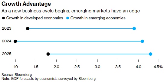 Tellimer策略师Hasnain Malik表示,“如果我们真的看到了美国利率的峰值,那么随着外国资本的重新投资,新兴市场中规模较小、经济状况较差的国家的股市应该会表现良好——比如埃及、尼日利亚、巴基斯坦和土耳其,”“如果我们看到美国经济软着陆,那将有利于中国大陆、中国台湾和韩国等更大的新兴市场,因为它们依赖制造业出口部门。”