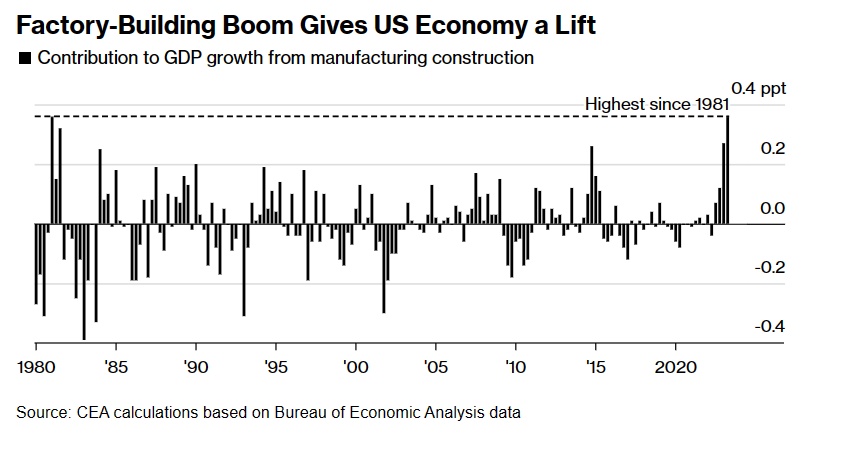在清洁能源和半导体等行业的联邦政府补贴和其他政府支持的刺激下,去年美国工厂建设支出几乎翻了一番。福特汽车(Ford Motor)和英特尔(Intel Corp.)等商业巨头,以及许多规模较小的公司,都在利用政府的支持计划建设新工厂。
