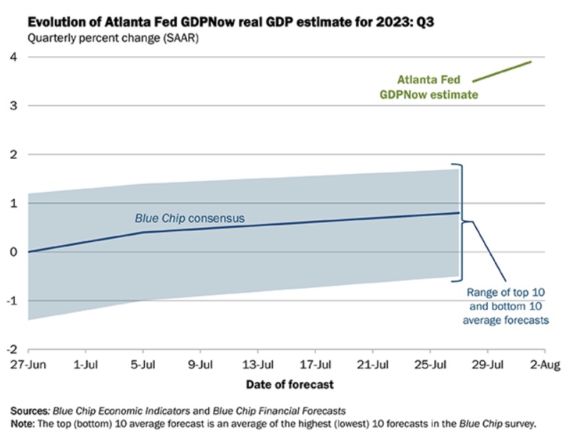 近期,美国经济软着陆(soft landing)预期迅速升温。亚特兰大联储GDPNow模型最新的预期数据显示,8月1日该模型初步预计美国第三季度GDP增速高达3.9%,高于截至7月28日该模型预测的3.5%。此前美国经济分析局7月27日发布的第二季度实际GDP环比增速初值为2.4%,好于市场预期的1.8%。