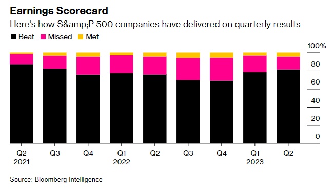 在这种背景下,经历了相对坎坷的第二季度后,利润增长的恢复或将给美国股市带来必要的推动力。根据数据显示,7%的利润萎缩将是自疫情熊市以来的最大降幅。并且,尽管多数企业的业绩超出了预期,但投资者并没有被打动。基准股指在2023年迄今已累计上涨17%,但自7月14日财报季开始以来仅上涨了0.7%。