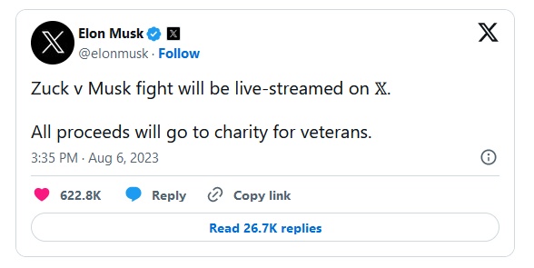 6月下旬,由于Meta计划推出推特竞品Threads,马斯克连续发推对其嗤之以鼻,甚至在遭到网友的挑衅后直言,“我愿意来场笼中斗,只要他愿意。”扎克伯格随后在Meta旗下平台Instagram上发文,示意马斯克把“把决斗地点发来”。马斯克也随即回应“拉斯维加斯八角笼”,双方正式达成“约架”。