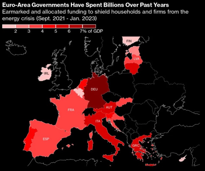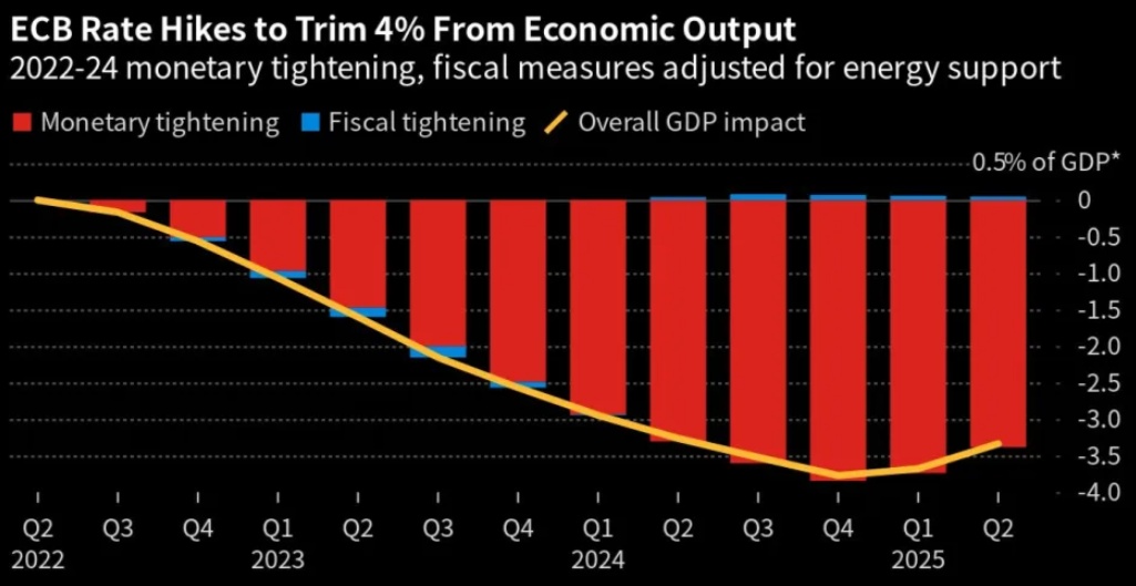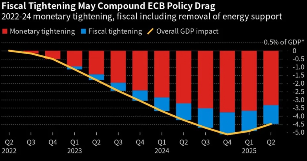当前的欧元区经济如履薄冰:财政支出再度受到限制和利率上升,这两者的结合有可能扼杀经济增长,并增加严重衰退的风险。彭博使用其SHOK模型进行的分析显示,去年开始的借贷成本上升所带来的滞后性痛苦将在2024年逐渐加剧,对GDP带来损失3.8%的打击。根据能源价格的不同,取消支持措施可能会将这一比例扩大到接近5%。