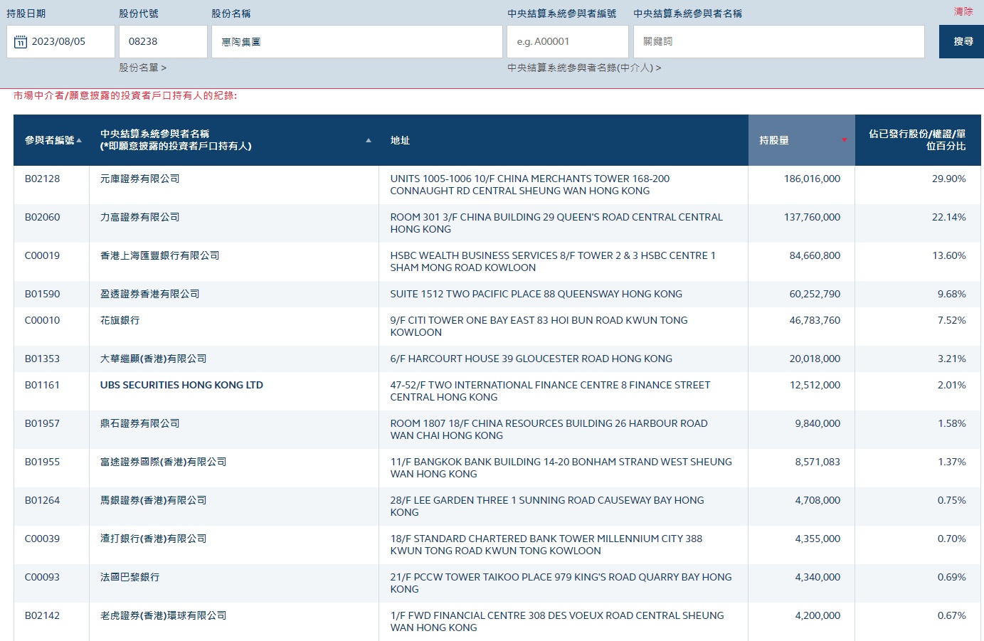 据中央结算系统(CCASS)资料,从3月14日起至本月初,元库证券的惠陶集团仓位由零增至1.86亿股,相当于已发行股本的29.9%,为最重仓的券商。同期仓位大幅增加的券商包括拥有不少散户投资者的汇丰、盈透证券(IB),仓位分别增加9.76百分点、9.55百分点。