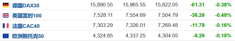 2.截至发稿,德国DAX指数跌0.38%,英国富时100指数跌0.48%,法国CAC40指数跌0.16%,欧洲斯托克50指数跌0.19%。