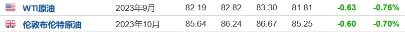 3. 截至发稿,WTI原油跌0.76%,报82.19美元/桶。布伦特原油跌0.70%,报85.64美元/桶。