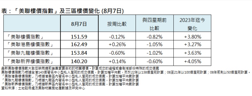 “美联港岛楼价指数”最新报162.49点,按周升0.26%;但较四周前仍跌1.05%;而本年迄今升3.27%。