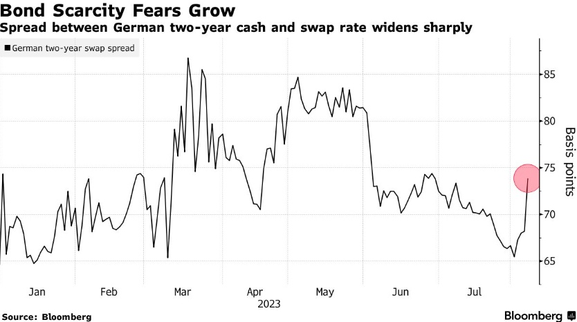 截至7月底,德国央行的一般政府存款为540亿欧元(590亿美元),约为历史最高水平的五分之一。不过,交易员们担心,这种快速转变可能会加剧该地区优质抵押品的稀缺。追逐优质证券的资金激增也会降低债券收益率,并阻碍加息向市场传导。