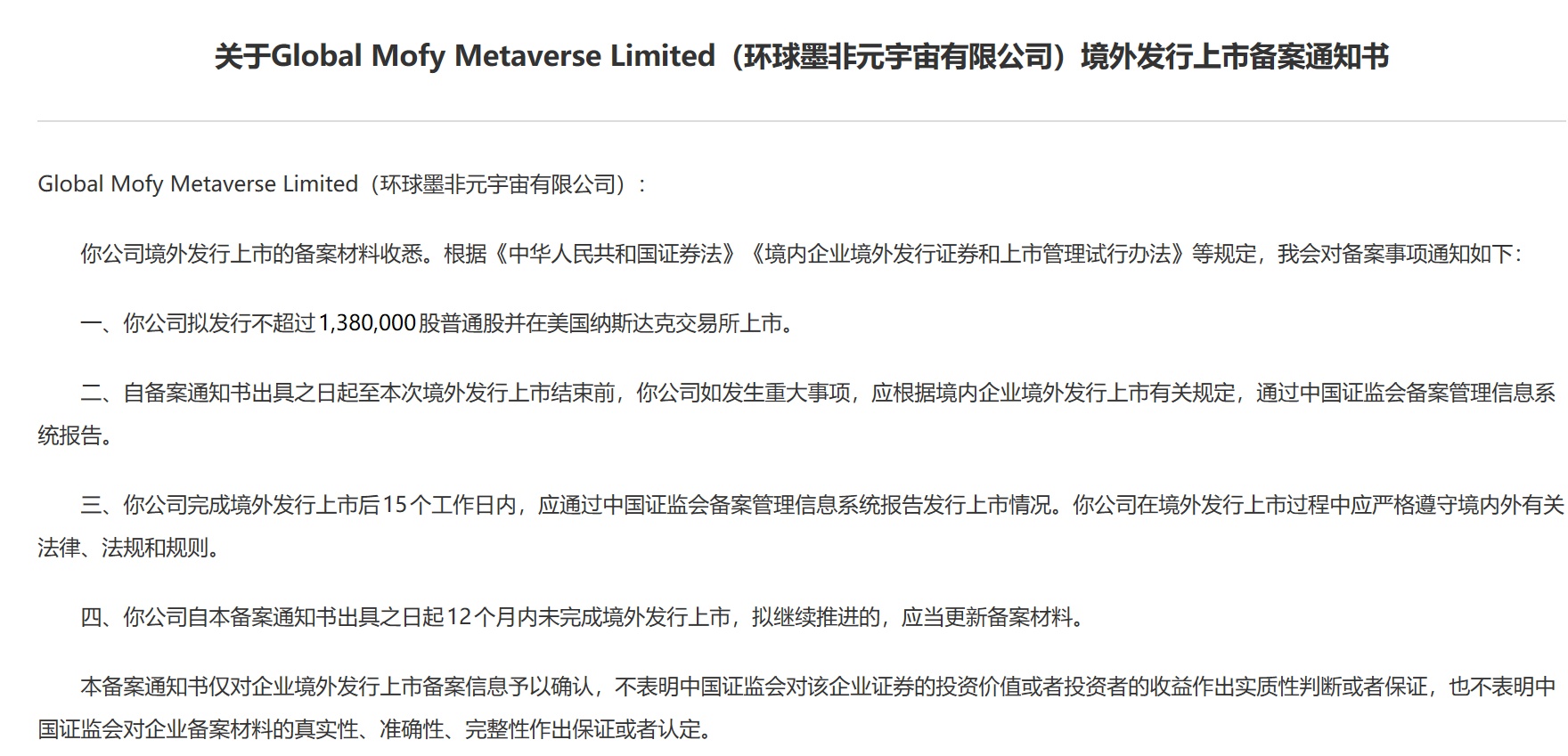 智通财经APP获悉,8月7日,中国证监会发布关于环球墨非元宇宙有限公司(GMM.US)境外发行上市备案通知书。公司拟发行不超过1,380,000股普通股并在美国纳斯达克交易所上市。据了解,2022年11月23日,环球墨非向美国证监会递交招股书,拟在纳斯达克上市。