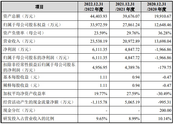 财务方面,于2020年、2021年、2022年,公司实现营业收入分别为1.37亿元、2.1亿元、2.35亿元,其中,公司实现净利润分别为-1966.86万元、4847.72万元、6111.35万元。