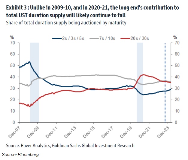 考虑到即将到来的拍卖带来的供应压力,投资者是否会要求长期债券更高的风险溢价?目前还没有。在高盛看来,所谓的美国国债再融资规模仅略高于预期,而且此次发行实际上较少偏向于期限较长的债券;