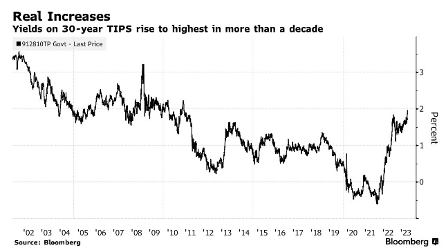 在这些策略师发出乐观的基调之前,上周的抛售已将今年美国政府债券的回报率降至仅0.7%,此前在2022年更是一度达到亏损12%。经通胀调整后的30年期国债收益率达到近2%,为2011年以来的最高水平。