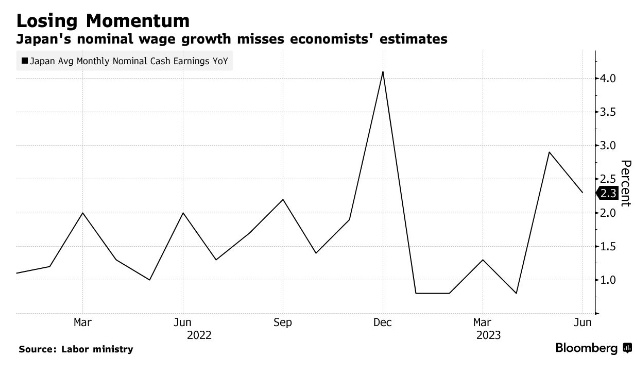 Bloomberg Economics经济学家Taro Kimura表示:“6月份劳动力现金收入的增幅较小,也低于预期,这削弱了由工资增长支撑的稳定通胀前景。周二数据的细节显示,工资上涨的潜在势头正在减弱。”