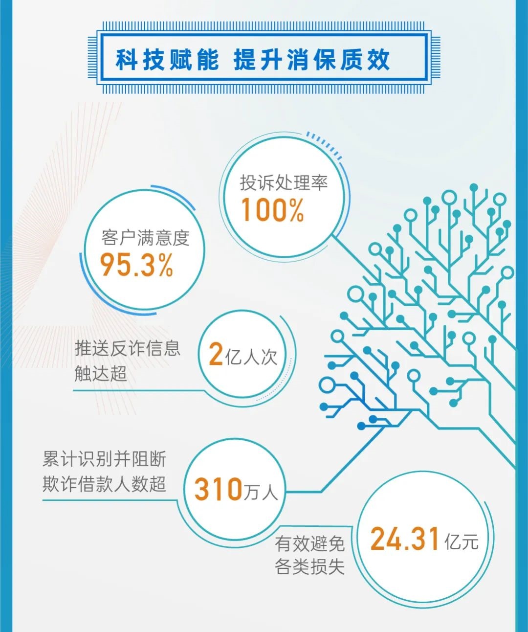 服务立行,消保先行。嘉银金科始终以科技+数字为双轮驱动,将消费者权益保护贯穿于整个业务流程。嘉银金科用心聆听客户心声,畅通沟通渠道,设置官方电话、在线客服、公共邮箱、社区论坛等,高效便捷地解决用户诉求。报告显示,2022年客户满意度达95.30%,投诉处理率达100%。在消保宣传方面,嘉银金科通过多种渠道推送反诈信息,触达超2亿人次。