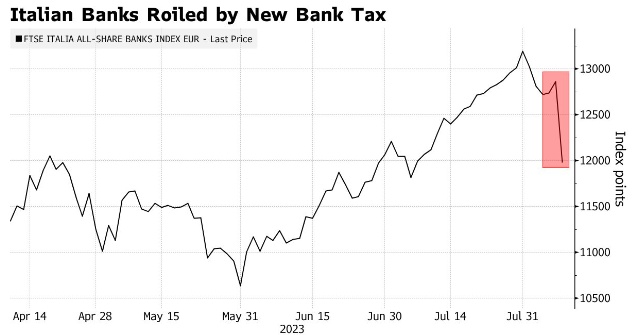 消息公布后,意大利银行股将成为关注焦点。意大利右翼政府此次对银行的暴利征税导致该国主要银行在米兰股市下跌。意大利银行股是欧洲股市中表现最差的,周二引领欧洲斯托克600指数下跌,意大利联合信贷银行股价下跌6.7%,意大利联合圣保罗银行股价下跌约8.6%。银行股的下跌使得意大利银行95亿欧元(104亿美元)的市值蒸发。 截至发稿,意大利FTSE MIB指数下跌2.1%,跌幅居欧洲之首。欧元区银行指数暴跌3.4%,创3月份以来最大跌幅。