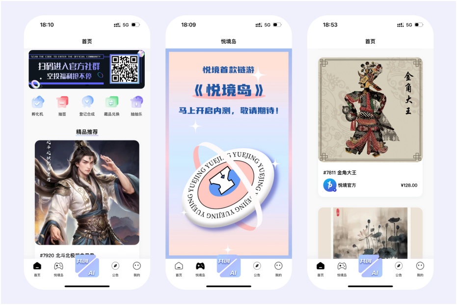 今年7月,耀世星辉推出基于“北辰星悦”人工智能大模型的内容创作工具悦灵犀AI,悦境APP向用户开放使用AI对话功能。同时,悦境还融合AIGC技术,推出AI数字艺术共创活动,用户可以在悦境上以多种模式体验AI创作个人数藏作品,进一步拓展数字藏品的表达创新与产品价值。数字艺术创作百花齐放,是文化发展的新范式,成为Z世代追捧的艺术形态之一。此外,备受期待的悦境链游功能“悦境岛”也即开启内测。链游是基于区块链技术的游戏,游戏内各类道具将以“NFT”的形式呈现,游戏数据采用去中心化的存储方式记录于区块链之上,保证了游戏的公平性和虚拟资产的安全性,同时也为广大数藏爱好者开拓了更多的数字资产的应用形式。