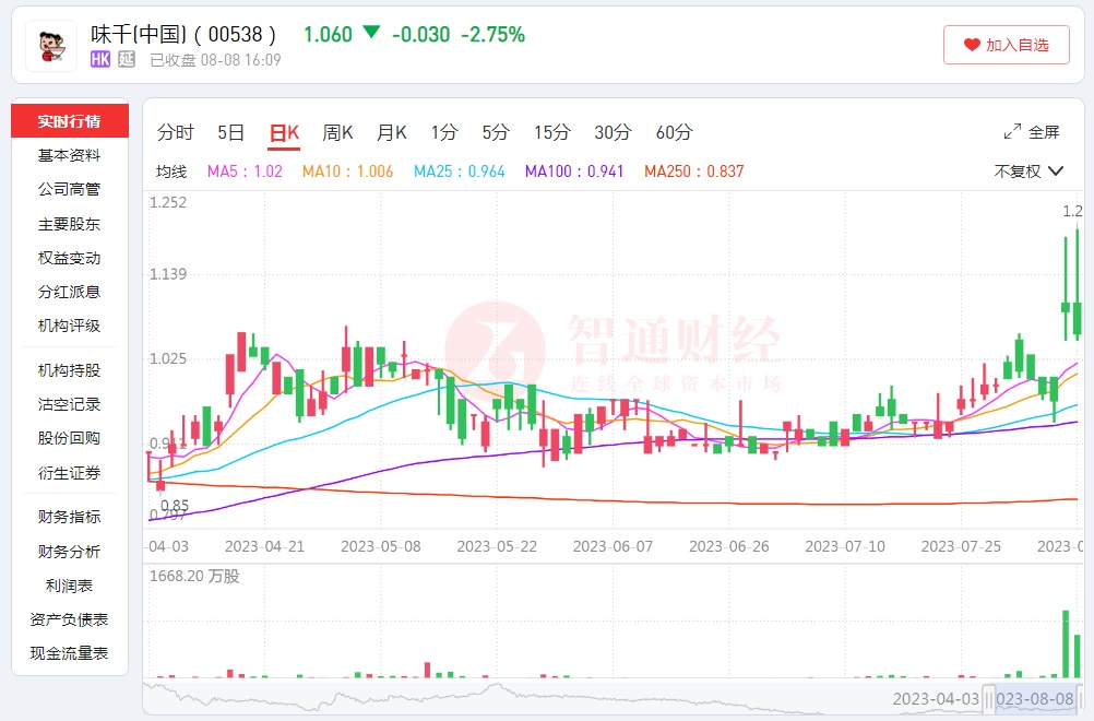 受此消息提振,8月7日味千中国股价强势拉升,盘中一度涨超14%,截止收盘股价大涨12.37%,报于1.09港元。然而,隔日味千中国并有有守住胜利果实,股价回落2.75%至1.06港元。