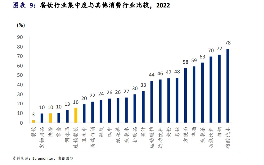 据 Euromonitor 数据,2022年中国餐饮行业前 三名的市场份额合计仅为 3%,市场极度分散。即使只看连锁餐饮细分板块,集中度依然远低于大部分其他消费行业。
