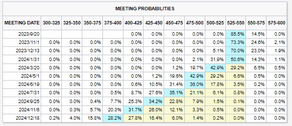 在9月份的政策会议之前,官员们将有更多的关键经济数据在手,包括定于周四公布的最新消费者价格指数报告。根据期货合约价格,投资者目前普遍预计今年不会再加息。CME“美联储观察工具”还显示,市场预期美联储在9月19日至20日的会议上维持利率不变的可能性超过85%,最早可能在2024年3月首次降息。
