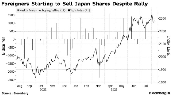 日本财务省数据显示,截至7月28日的一周,外国投资者净卖出2570亿日元(18亿美元)的日本股票和期货,此前在4月至6月期间净买入9.49万亿日元,这是一个季度的创纪录数量。
