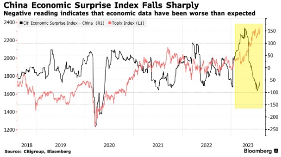 使用市值加权平均数汇编的数据显示,在东京上市的公司中,约16%的营收来自中国,而且只包括那些报告在华销售情况的公司。Fanuc Corp.和Murata Manufacturing Co.等公司在中国的风险敞口相对较高,因此它们的股票对经济减速的迹象更加敏感。