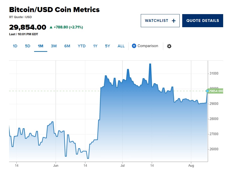 Metrics的数据,比特币周三延续涨势,一度突破30000万美元关口,截至发稿,该加密货币涨2.71%,至29854.00美元。截止周一,比特币价格已连续14天未能在任何一个方向上波动超过1%。