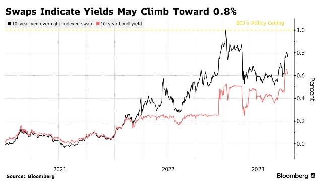 投资者继续对冲10年期国债收益率的进一步上涨,该期限的隔夜指数掉期目前为0.76%,这比基准债券的收益率高出约15个基点,但仍低于日本央行新的1%的有效上限。