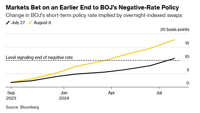 智通财经APP获悉,日本央行放松对基准10年期国债收益率的控制,正开始动摇市场对短期借贷成本的前景,掉期交易员押注,日本央行将最短在8个月内就会结束负利率政策。