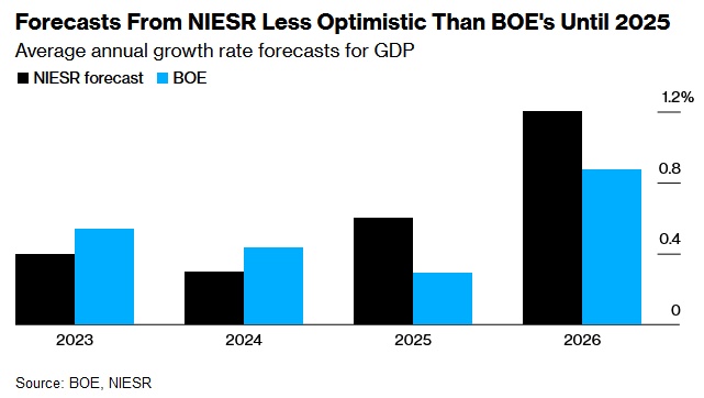 NIESR的这些预测与英国央行对经济前景的悲观看法相呼应。英国央行上周表示,预计国内生产总值(GDP)在“中期”内仍将低于疫情前的水平。