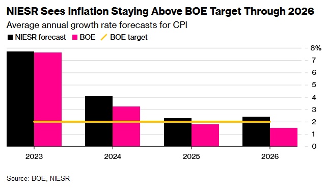 对于英国的通胀状况,NIESR预测,到今年底,整体通胀率将从目前的7.9%降至5.2%,但此后降幅将放缓,2025年、2026年和2027年的平均通胀率都将略高于英国央行2%的目标。