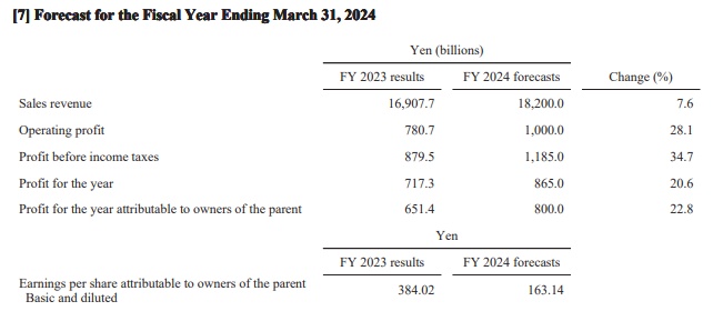 营收增长20.8%,达到4.62万亿日元。归母净利润为3630.1亿日元,上年同期为1492.2亿日元;基本和摊薄后归母每股收益为219.06日元,上年同期为87.23日元。