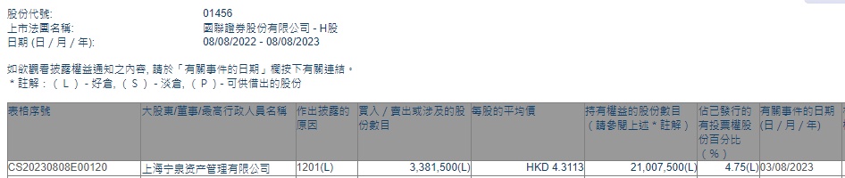 智通财经APP获悉,香港联交所最新资料显示,8月3日,上海宁泉资产管理有限公司减持国联证券(01456)338.15万股,每股作价4.3113港元,总金额为1457.87万港元。减持后最新持股数目为2100.75万股,最新持股比例为4.75%。