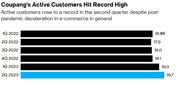第二季度,Coupang的活跃客户(即至少一次直接从其应用程序或网站上下单的客户)增至创纪录的1970万,较上年同期增长10%。