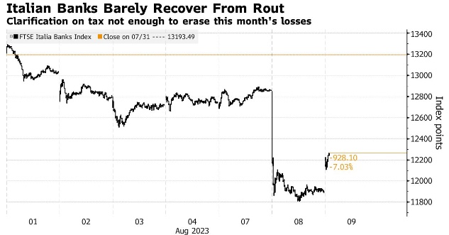 受此消息影响,欧洲银行股于8月8日暴跌,创下自3月瑞士信贷危机引发银行业动荡以来的最大单日跌幅;泛欧斯托克600指数8月8日也收跌0.23%。周二市场出现负面反应后,意大利财政部立即寻求缓解这些担忧。首先,它发布了一份声明,解释说,意大利政府将在两种方案中做出选择,选择金额最高的方案。第一个方案将对2022年和2021年净利息收入之差征收40%的税(当差额超过3%时)。第二种选择的目标是2021年至2023年的净利息收入差额,最低为6%。税收不能超过银行股东权益的25%。