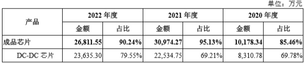 截至报告期末,公司可售芯片型号近1,600款,其中DC-DC芯片共460余款,支持多种电压电流转换、多种开关频率、多种功能模式、多种封装形式,可广泛应用于网络通信、安防监控、智能电力、消费电子、智慧照明、工业控制、医疗仪器、汽车电子等众多领域。2022年公司芯片总销量达13.94亿颗,其中DC-DC芯片总销量达11.69亿颗。