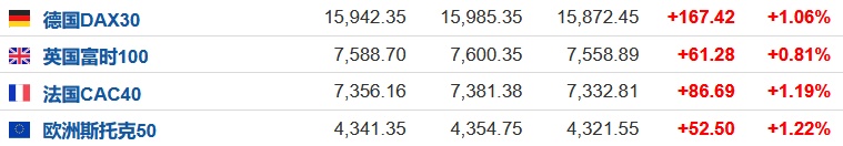 2.截至发稿,德国DAX指数涨1.06%,英国富时100指数涨0.81%,法国CAC40指数涨1.19%,欧洲斯托克50指数涨1.22%。