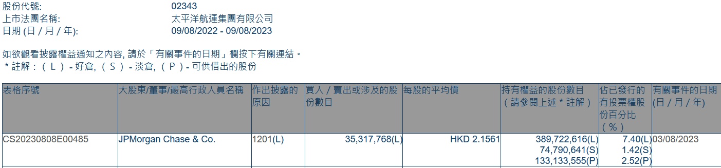 智通财经APP获悉,香港联交所最新资料显示,8月3日,小摩减持太平洋航运(02343)3531.7768万股,每股作价2.1561港元,总金额约为7614.86万港元。减持后最新持股数目约为3.90亿股,最新持股比例为7.40%。