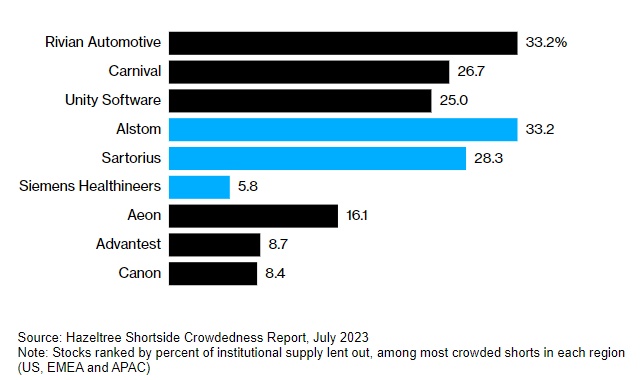 这与电动汽车制造商Rivian形成了鲜明对比,Rivian 33%的机构股被借出,是美洲大盘股中最高的,其拥挤度得分为74分。此外,据Hazeltree的数据显示,高速列车制造商Alstom SA的机构出借股得分也为33%,是欧洲、中东和非洲大盘股中最高的,其拥挤度得分为88。