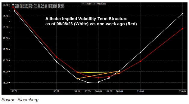 根据汇编数据显示,截至周二收盘,押注阿里巴巴港股上涨5%的看涨期权合约比看跌期权合约有更大的溢价。与一周前相比,衡量市场仓位和情绪的波动性偏度已经转向更为乐观的一面。