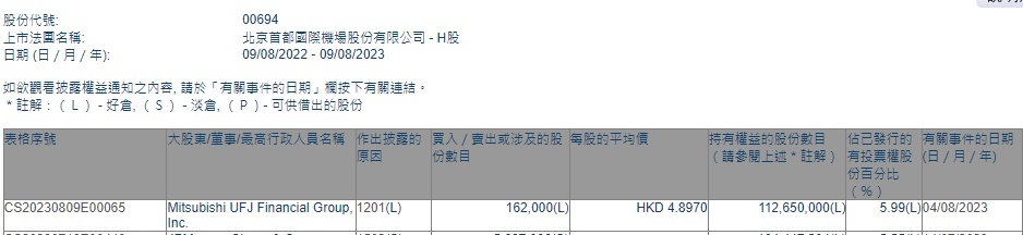 Inc.减持北京首都机场(00694)16.2万股,每股作价4.897港元,总金额约为79.33万港元。减持后最新持股数目为1.13亿股,最新持股比例为5.99%。