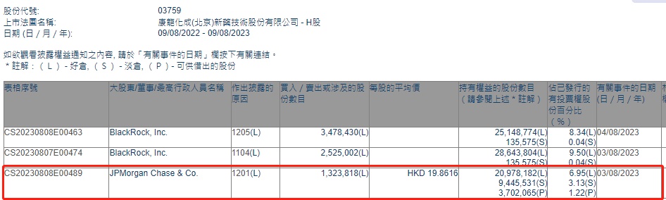 智通财经APP获悉,香港联交所最新资料显示,8月3日,小摩减持康龙化成(03759)132.3818万股,每股作价19.8616港元,总金额约为2629.31万港元。减持后最新持股数目约为2097.82万股,最新持股比例为6.95%。