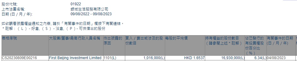智通财经APP获悉,香港联交所最新资料显示,8月4日,第一北京投资增持银城生活服务(01922)101.6万股,每股作价1.6537港元,总金额约为168.02万港元。增持后最新持股数目约为1693万股,最新持股比例为6.34%。