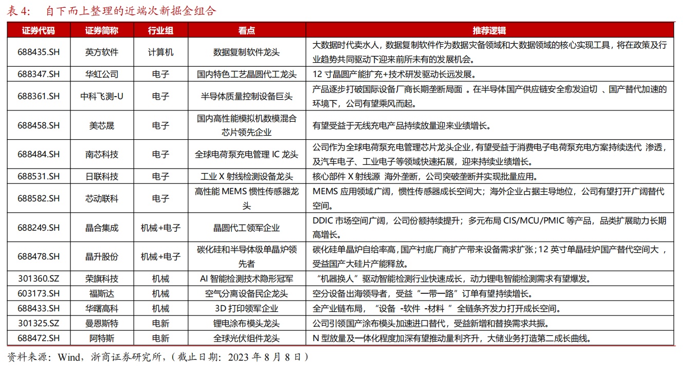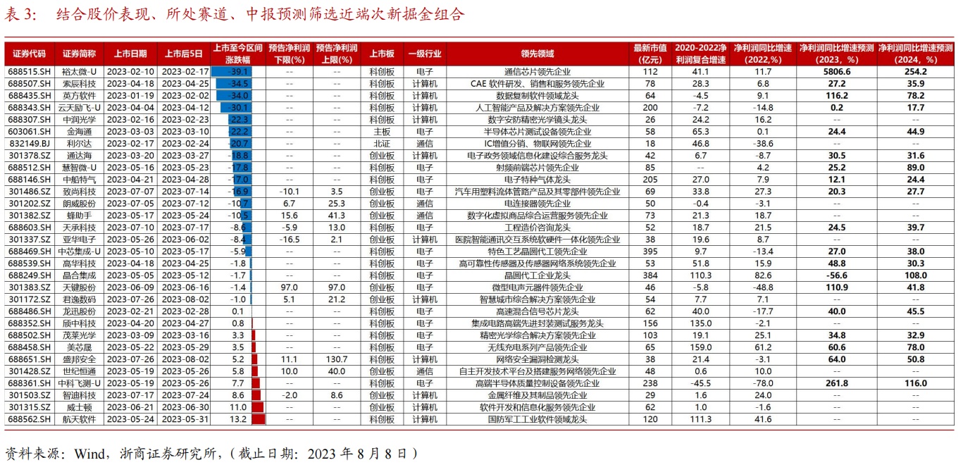 就选股逻辑而言,其一,时间是今年上市;其二,行业以TMT为主;其三,上市之后调整较为充分;其四,2023年中报预增或2023-2024净利润增速为正。
